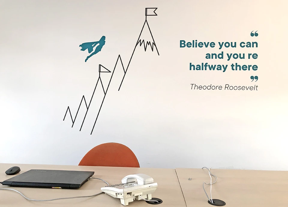 Vezi exemple de decorare pereti birou cu autocolant printat sau colorat in masa, solutii ideale pentru branding si spatii moderne.